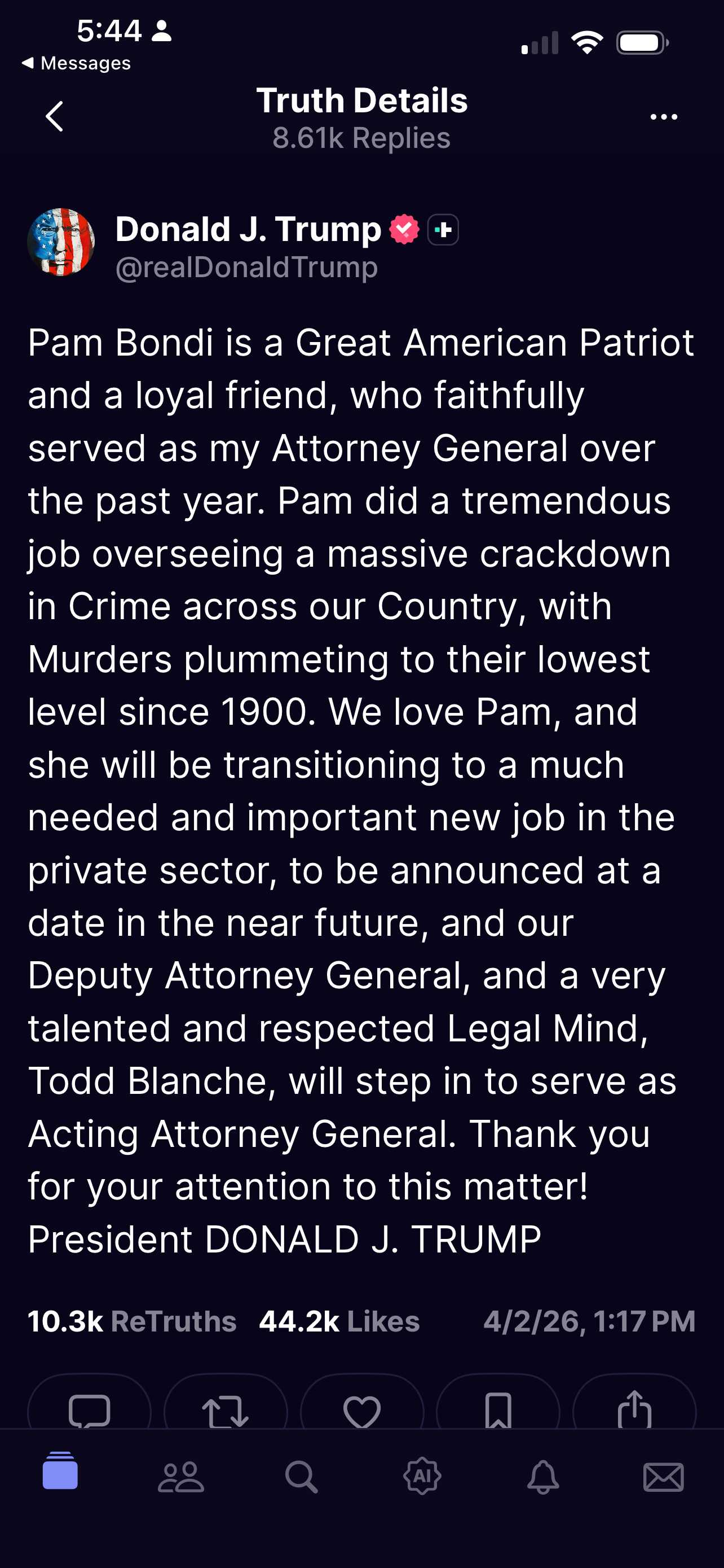 Official Statement from DJT re: Pam Bondi for those who don’t have Truth Accts